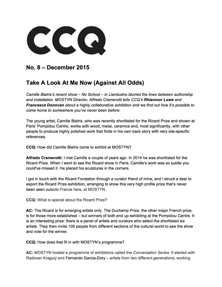 Press coverage for MOSTYN’s exhibitions: Camille Blatrix + Women’s Art Society II + Thomas Goddard » No School_Camille Blatrix_CCQ interview-1