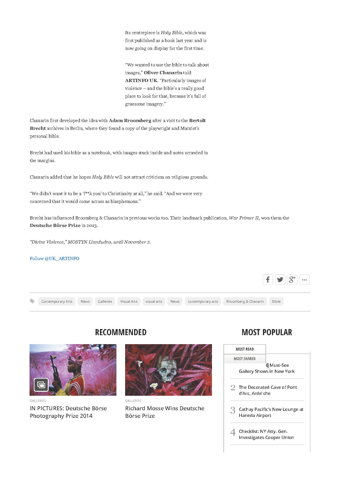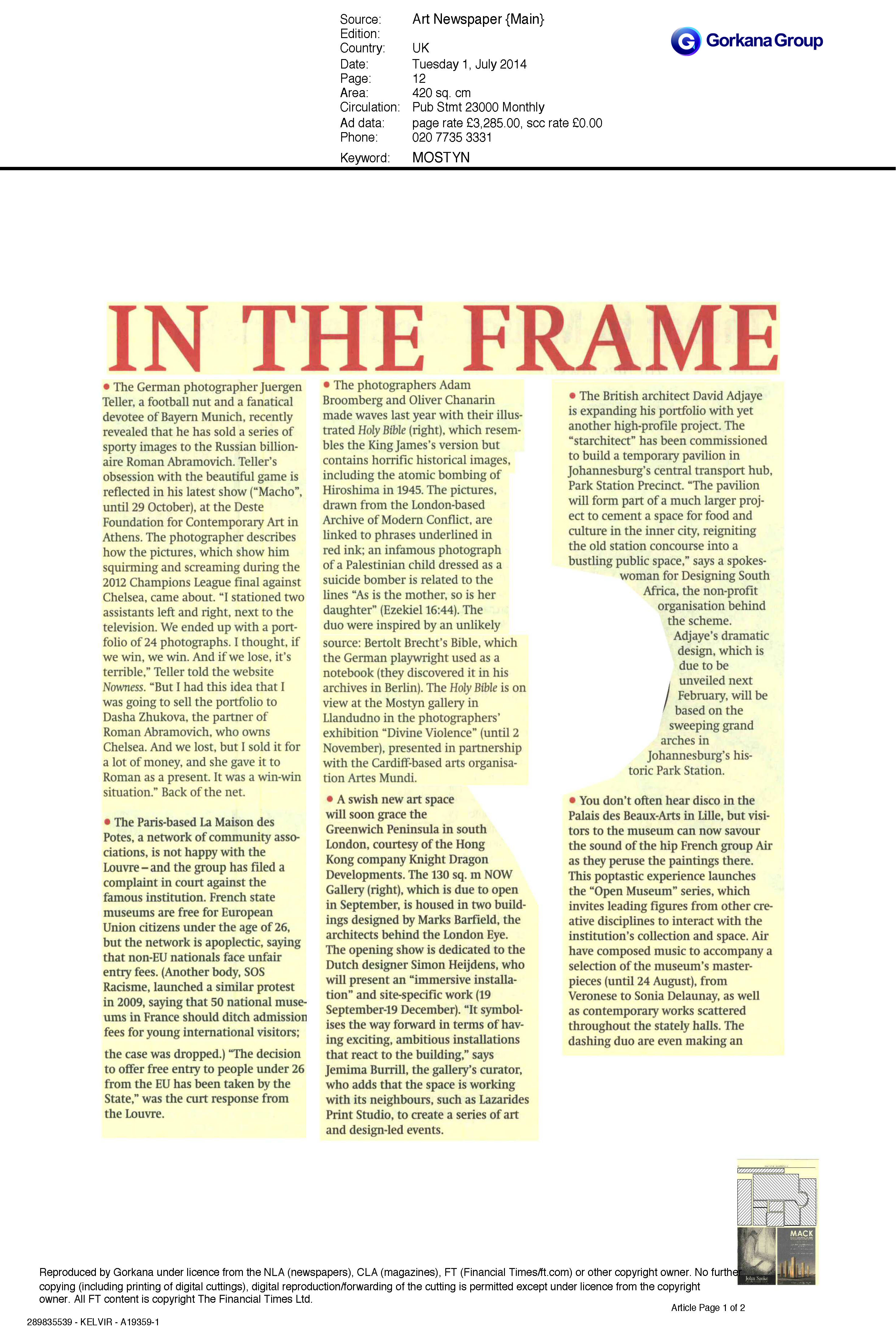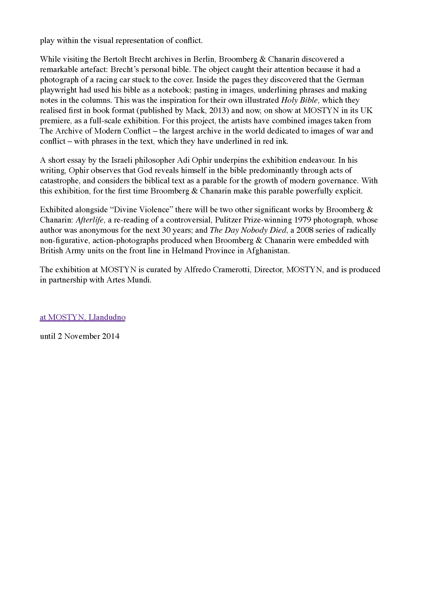 Press coverage for MOSTYN exhibitions: Broomberg & Chanarin and WAR, Jul-Nov 2014