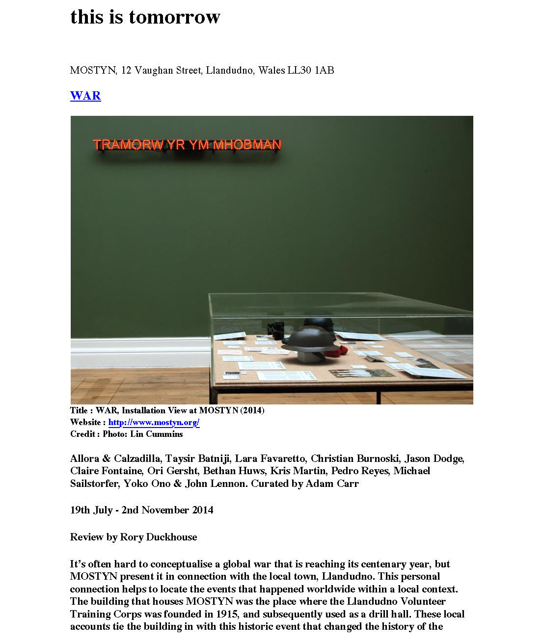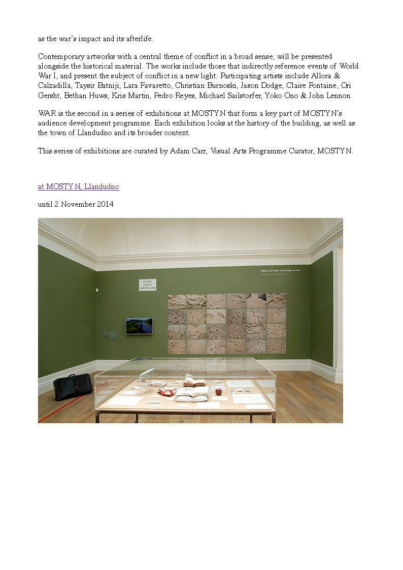 Participating artists: Allora & Calzadilla, Taysir Batniji, Lara Favaretto, Christian Burnoski, Jason Dodge, Claire Fontaine, Ori Gersht, Bethan Huws, Kris Martin, Pedro Reyes, Michael Sailstorfer, Yoko Ono & John Lennon; and a historical display of Llandudno in WW1.