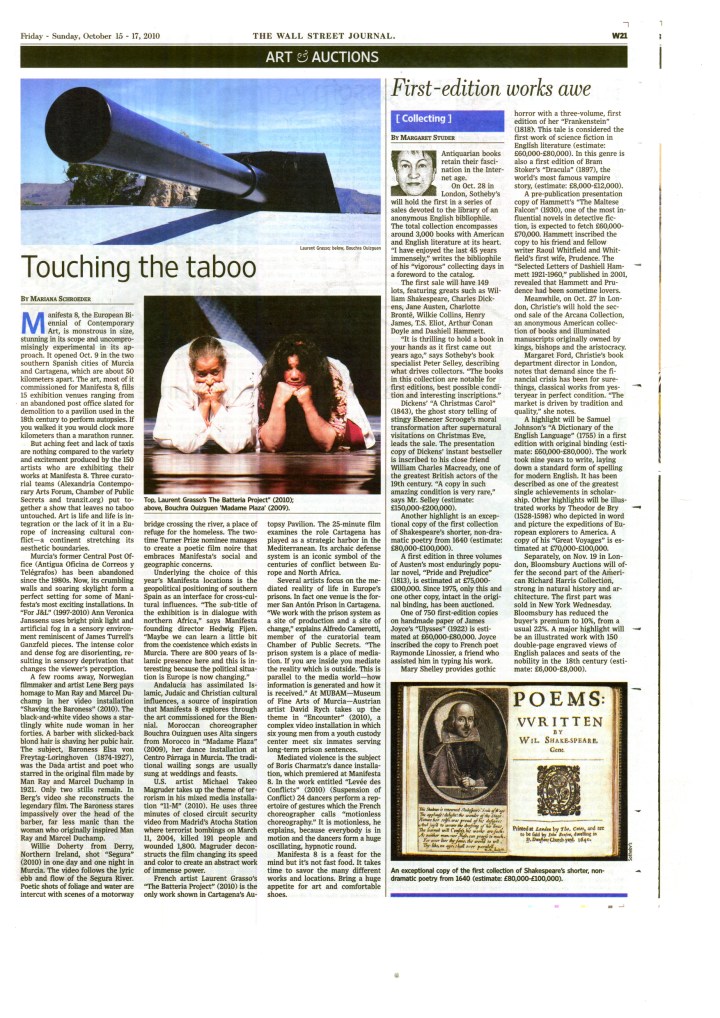 In this era of mega-biennials, huge art fairs and ever-expanding modern art museums, Manifesta 8 – the roving European Biennial of Contemporary Art currently taking place in Murcia and Cartagena in south-eastern Spain – can be seen in terms of being a cultural undertaking of grand proportions. Until January 9, Manifesta 8 takes place in two cities, organized by three curatorial groups, in 14 venues, with 65 parallel events, featuring more than 150 contributing artists, and accompanied by a 400-page book. However, it is also an event which focuses on intimacy and precise social themes, ranging from matters of surveillance, language, media interference, aspects of time, ethnic links, incarceration, blindness, and Europe’s present-day relationships to northern Africa, including such pressing issues as migration, refugee-status and integration. There are many surprises. Given the unusual context of Manifesta 8, set in a variety of buildings including museums, military barracks, a former post-office, a casino, an abandoned hospital building and even San Anton Prison, many of the artworks provided poignant echoes of the sites where they are installed. After all, what could be more evocative than works of art based on oppression or paying homage to political prisoners, exhibited inside cells in a building that until last June still housed inmates.