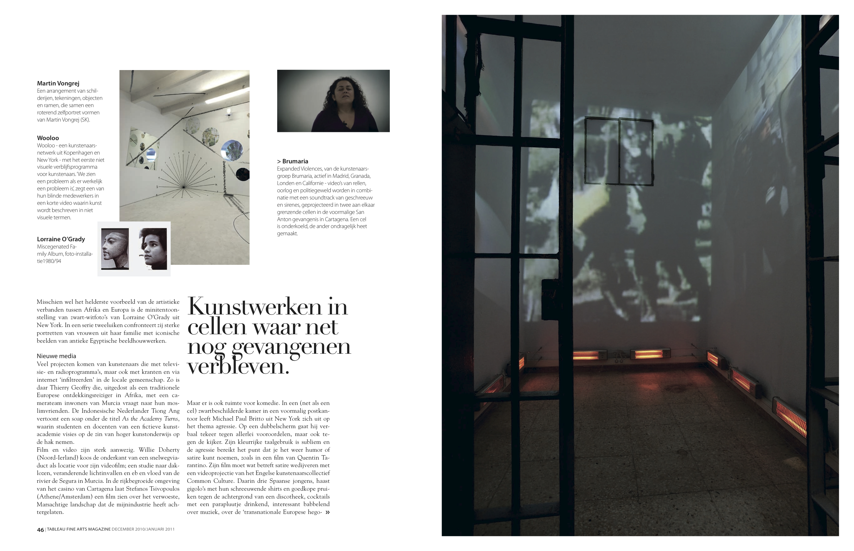 Operating in Madrid, Granada, London and California, the artist group Brumaria presents Expanded Violences. Their videos of riots, war and police brutality, accompanied by a soundtrack of shouting and sirens, are projected in two adjacent cells in the former San Anton Prison in Cartagena. One cell is chilled by air-conditioning, the other made unbearable by heaters turned up high.
