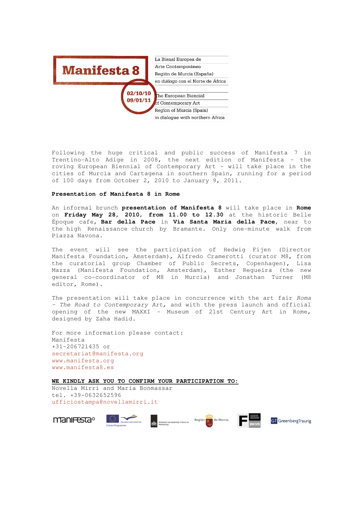 The event will see the participation of Hedwig Fijen (Director Manifesta Foundation, Amsterdam), Alfredo Cramerotti (curator M8, from the curatorial group Chamber of Public Secrets, Copenhagen), Lisa Mazza (Manifesta Foundation, Amsterdam), Esther Regueira (the new general co-coordinator of M8 in Murcia) and Jonathan Turner (M8 editor, Rome).