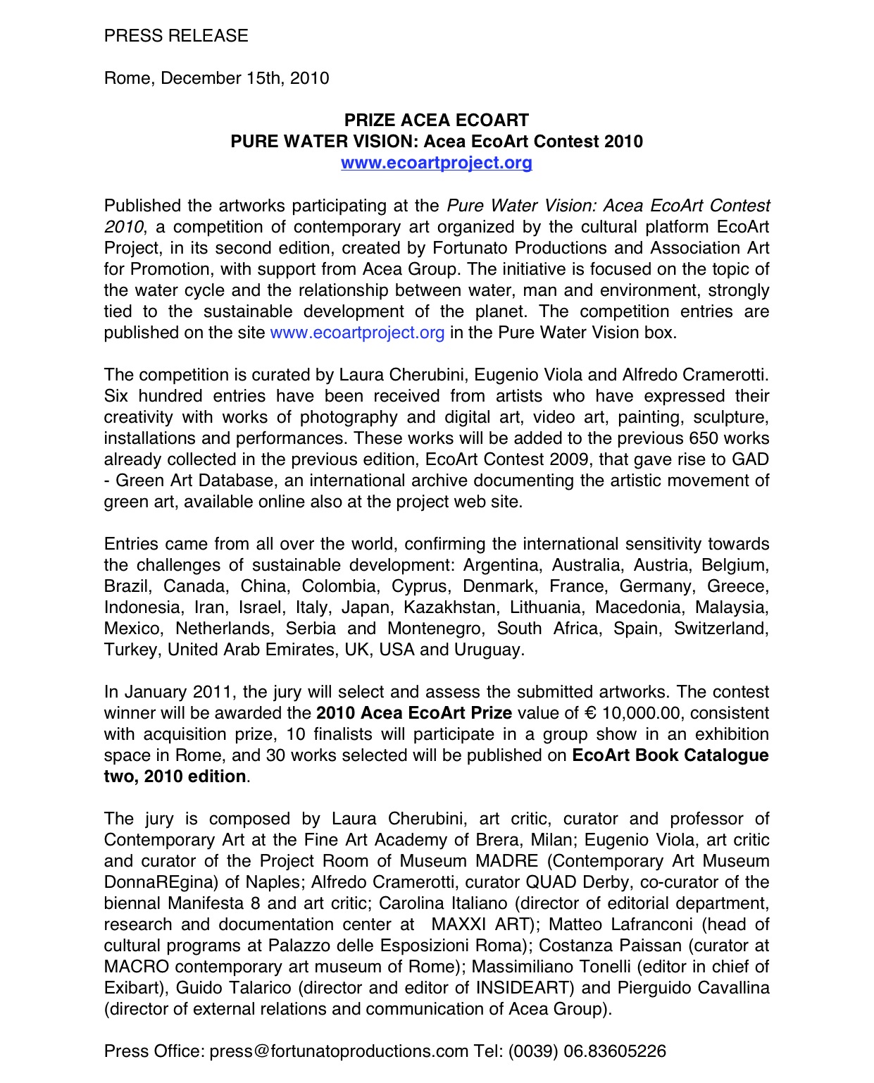 EcoArt Project info@ecoartproject.org – Ufficio stampa: press@fortunatoproductions.com