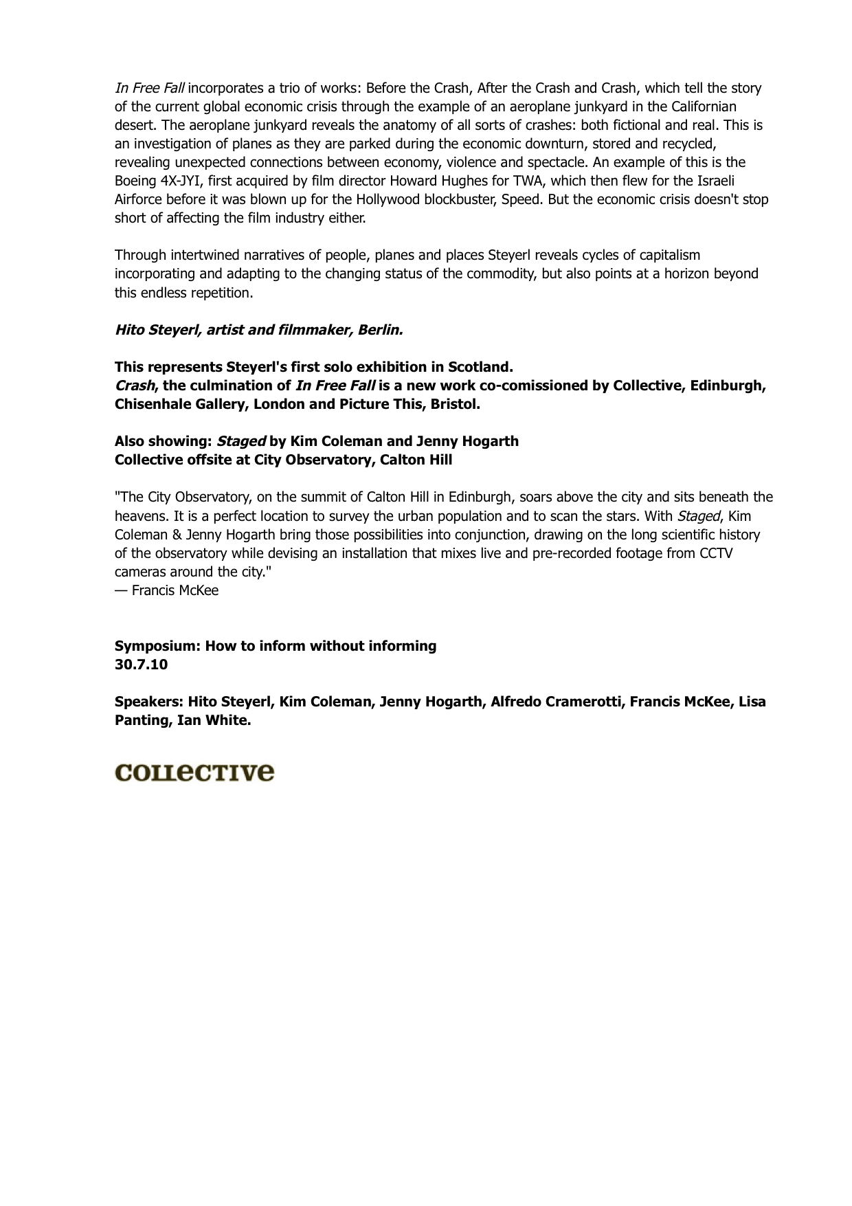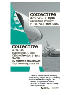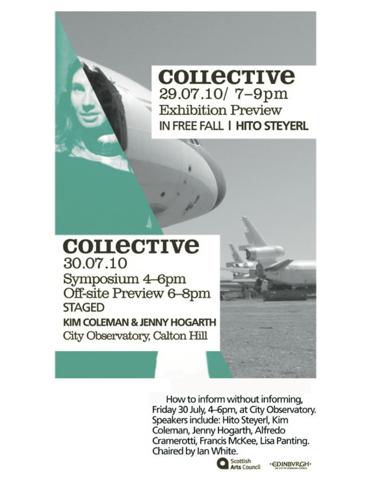 To celebrate the launch of two new commissions, Collective devised a symposium which took place on 30th July 2010 featuring exhibiting artists Hito Steyerl, Kim Coleman and Jenny Hogarth. Other speakers included theorist Alfredo Cramerotti (author of Aesthetic Journalism), Francis McKee (curator and writer), Lisa Panting (Director of Picture This, Bristol) and Collective director Kate Gray. The symposium was chaired by Ian White (LUX, London) and was held at the City Observatory atop Calton Hill.