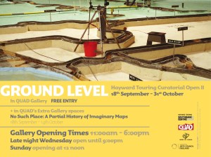 Artists include: Maria Thereza Alves; The Atlas Group; Ricardo Basbaum; Heath Bunting and Kayle Brandon; Center for Land Use Interpretation; Simon Evans; Yolande Harris; Christian Philipp Müller; Eyal Weizman; Stephen Willats. Ground Level is a Hayward Touring exhibition selected and developed in partnership with John Hansard Gallery; QUAD, Derby; Oriel Mostyn, Llandudno and Leamington Spa Art Gallery & Museum.