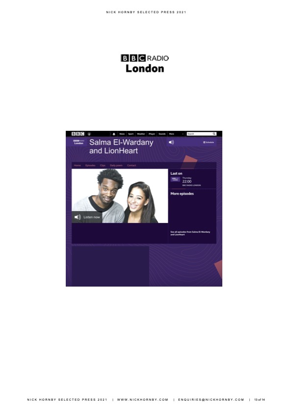 http://nickhornby.com/private/bbc-radio-london-interview-with-salma-el-wardany-and-lionheart