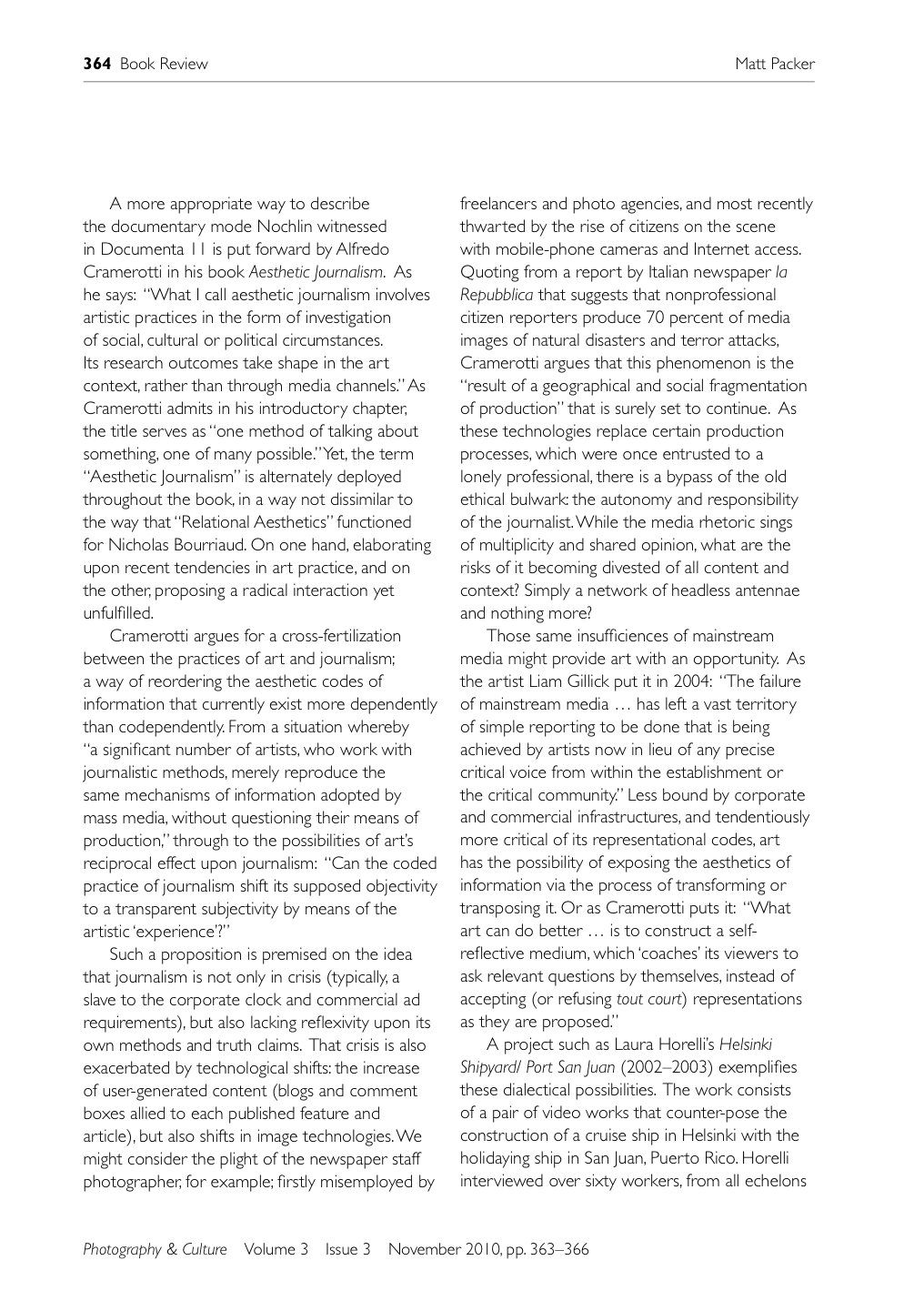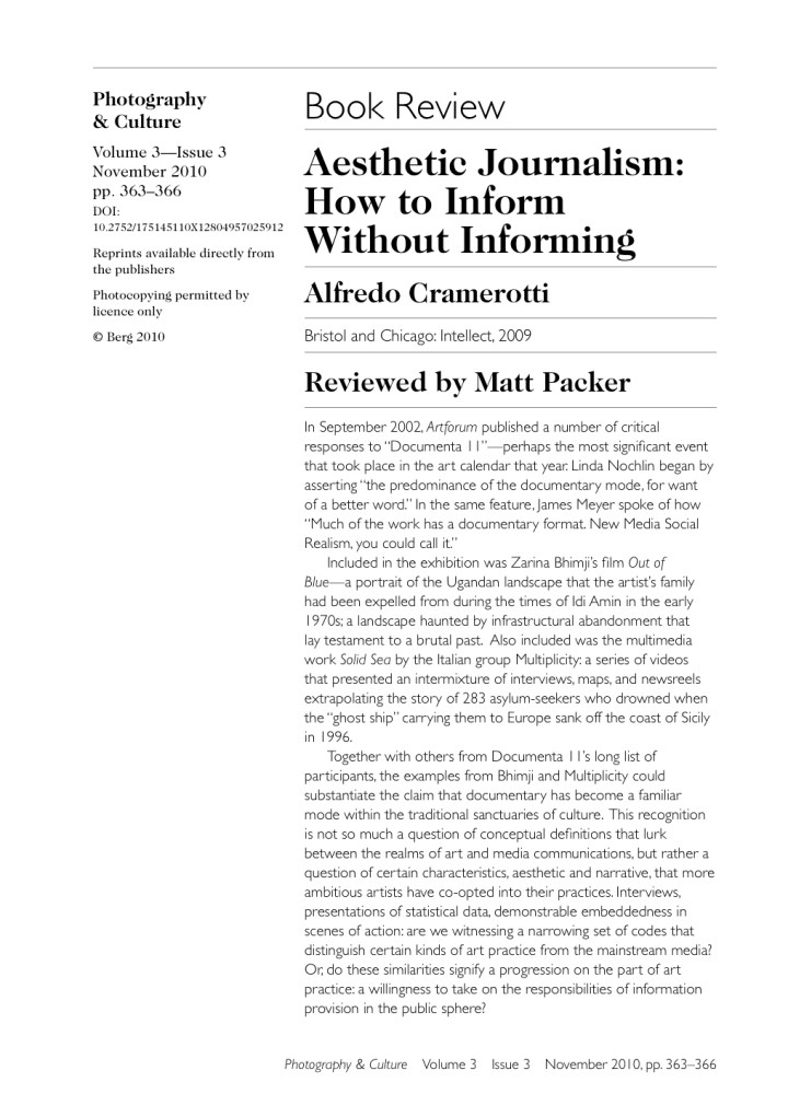 Over the past five years Alfredo Cramerotti has written about the aesthetic merger of contemporary art and the news media. By adopting the ubiquitous tropes of interviews, graphic mapping, and Magnum style photography an increasing number of artists have borrowed from these visual languages to present their work into a context closely aligned with investigative journalism. Drawing from his recent book Aesthetic Journalism: How to inform without informing (2009, Intellect) and select works from Uneven Geographies, Cramerotti will be speaking about the growing overlap between global news media and contemporary art.