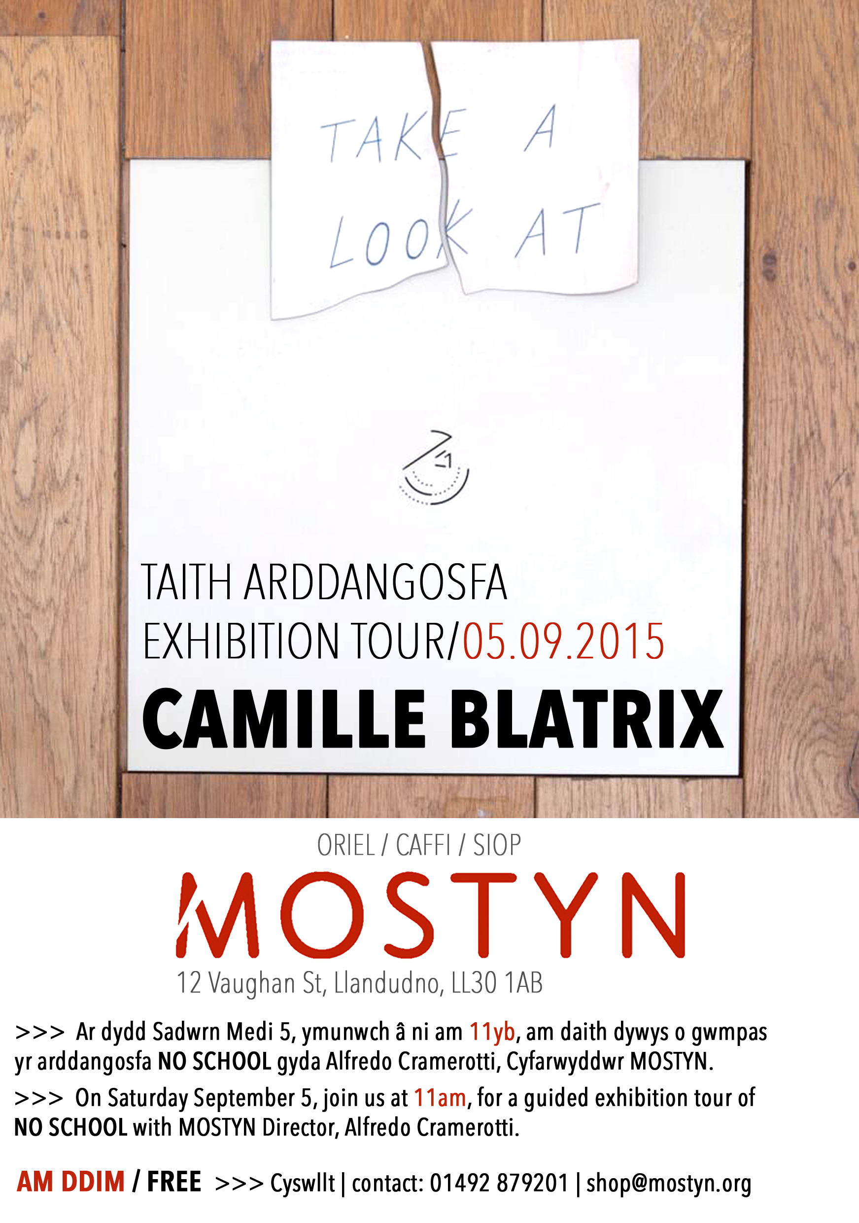 Free Talk & Tour of the exhibition ‘No School’ by Alfredo Cramerotti, Director, MOSTYN, on award-winning artist Camille Blatrix’s show at MOSTYN, 12 in Vaughan Street, Llandudno, UK at 11am on Saturday 5th September 2015.