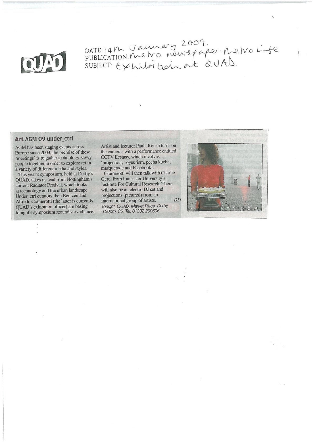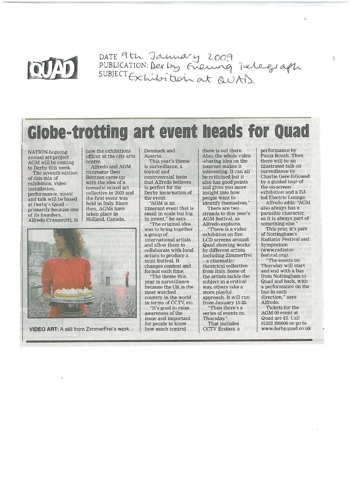 The 7th edition of the media/art project AGM (www.agmculture.org) is this year part of the Radiator Biennial Festival and Symposium (www.radiator-festival.org) and includes an exhibition, video installation, performance, music and talk; exploring our behaviour with technologies of surveillance and counter-surveillance in QUAD. From 15th to 25th January 2009, eight international artists, designers, writers and performers respond to the cultural environment generated by CCTV and (self) recording.